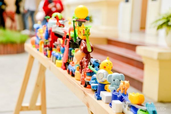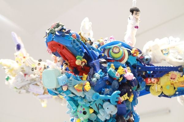 Không gian triển lãm là thế giới của hàng chục nghìn món đồ chơi nhựa cũ: từ búp bê, xe mô hình, nhân vật hoạt hình như Doraemon, Pikachu… đến những khối lego, bóng nhựa hay nắp chai nhiều màu. Tất cả được Fuji Hiroshi thu thập qua các chiến dịch cộng đồng tại Nhật Bản, làm sạch, phân loại theo màu sắc và kích thước, trước khi được gắn lên khung sườn để tạo thành những tác phẩm sắp đặt quy mô lớn.
